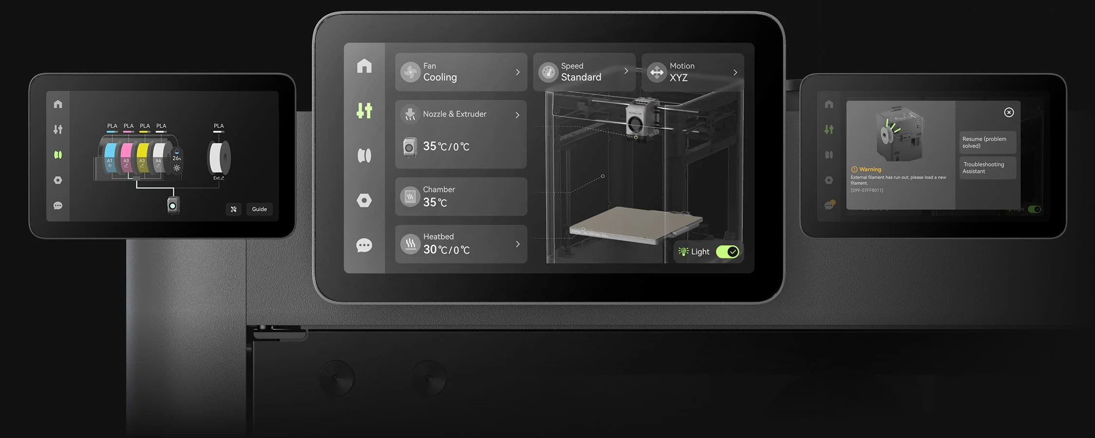 The 5” color touchscreen on the Bambu Lab P2S. Note that the illustration shows examples of views, there is only one screen.